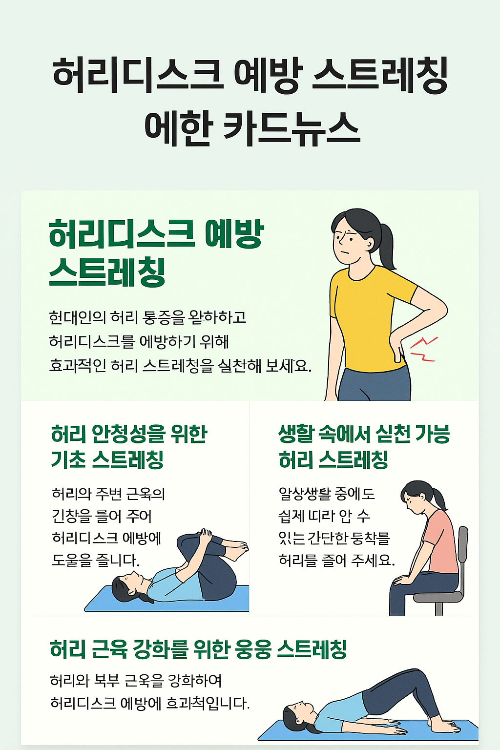 이 글에서는 허리디스크 예방을 위한 스트레칭을 기초 스트레칭, 생활 속 스트레칭, 근육 강화 스트레칭