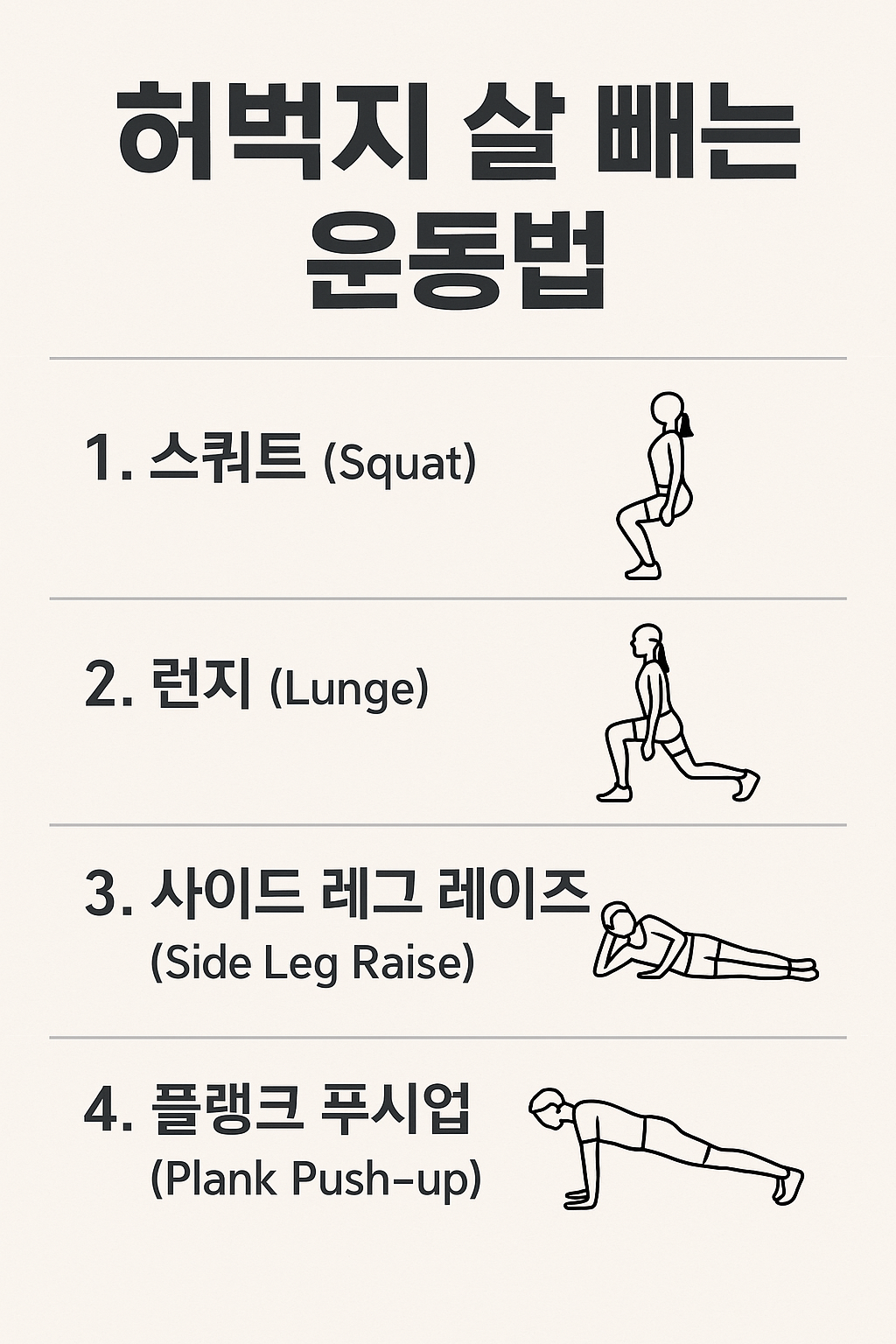 스쿼트, 런지, 사이드 레그 레이즈, 플랭크 푸시업과 같은 운동을 통해 허벅지 근육을 자극하고, 지방을 태우며,